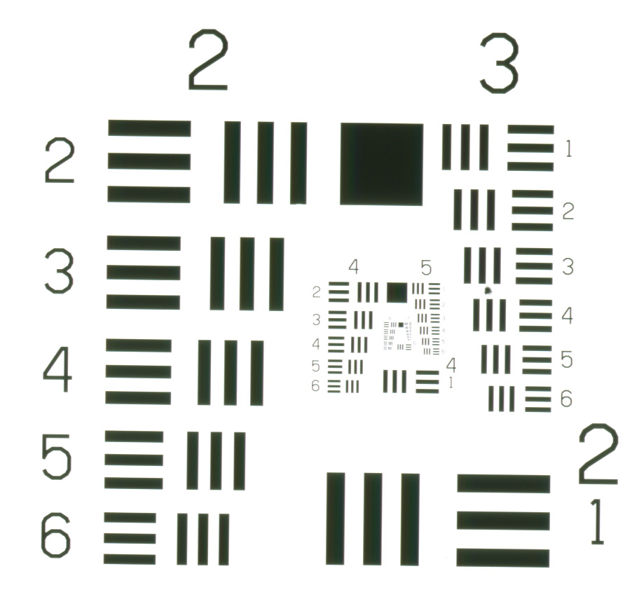 On the new target the resolution of the largest pattern in each group is 2 to the Nth power line pairs per millimeter, where N is the group number. Thus pattern 1 in group 0 is 1 lp/mm. For comparison, I believe the largest pattern on your slide is about 1.55 lp/mm (Group -4, pattern1). For intermediate patterns within a group, they are in steps of .1667. Thus pattern 2 in group 5 would be 2 to the 5.1667, or about 36 lp/mm.