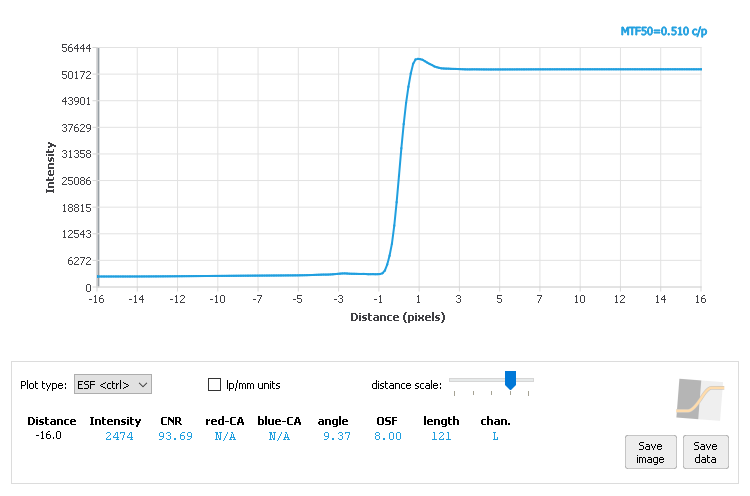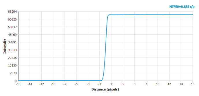 This is the setup I used for the experiment. Camera was set to f5.6, ISO 100, aperture priority, and the image was 10 feet away: ![]() The cropped portion to test sharpness with no lockup. ![]() This graph demonstrates the number of pixels it takes to transition from black to white. The slight hump at the top is the RAW file processor adding a slight bit of sharpening, but it doesn't affect the MTF numbers. ![]() This is MTF Mapper's interpretation of the graphic I created in Photoshop essentially cutting out the effects of blur that the digital sensor and camera lens introduce. ![]() The MTF50 graph shows it only takes about a pixel to transition from black to white. ![]() Jim Hutchison lives in Fox Cove-Mortier NL with his wife Moira and Pumpkin the cat. |