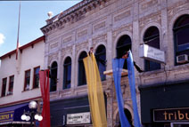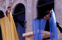 Here's a prime example of what I'm talking about... poorly framed, with no real defined subject matter. The original picture on the left was shot.. why? Dunno - there's way too much extreneous subject matter, so if I crop in to something interesting (shot #2), it gets better... but the subject matter is still tough to figure out. If you're wondering, it's 3 acrobats descending a building wall during the July 2004 Nelson Street Festival in British Columbia, Canada. So, if I examine the resolution at 100% (frame #3), you'll see that cropping in close results in a blurred image, mostly because I was shooting hand-held. A tripod would have resulted in a much sharper image. So even if frame #2 was interesting, a 8 x 10 print would be out of focus and tough to sharpen up acceptably.